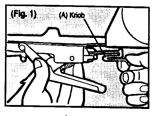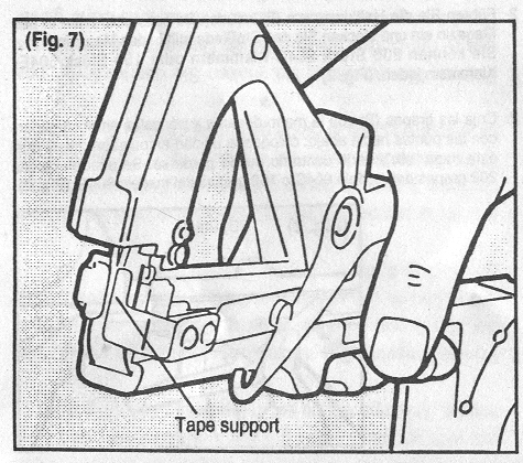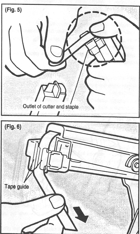 2. Set the tape. Hold lightly the head of the A type handle unit with left thumb, and pull the tape downward with right fingers. The tape will be set in the tape guide. (Fig. 5. 6)