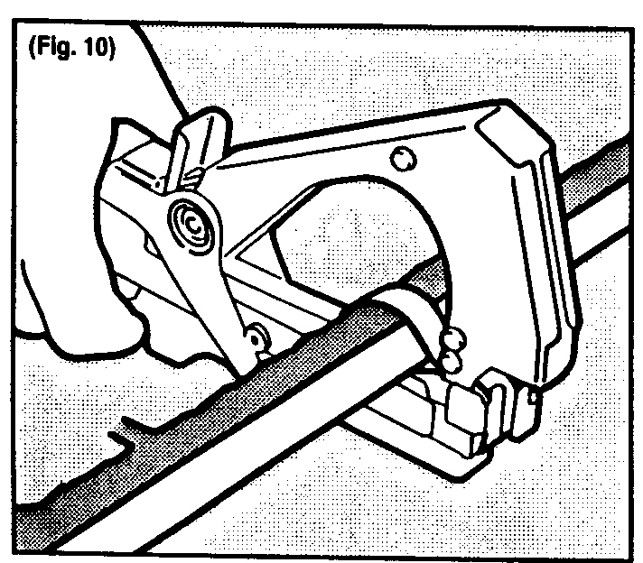 2. Then, press the handle fully with the tape positioned centrally, and the object will be bundled by both the tape and staple; simultaneously, the tpae is cut off. (Fig. 10)