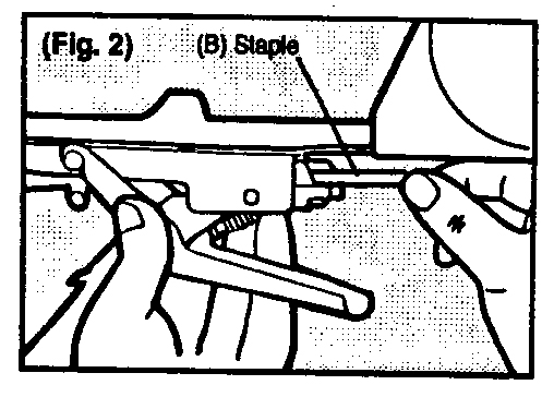 2. Pick up the stables (B) with right hand and load them into the magazine unit with the staple legs pointing downward; then set them in the pusher unit. You can load 200 staples of 604C type or 150 staples of 604E. (Fig. 2)
