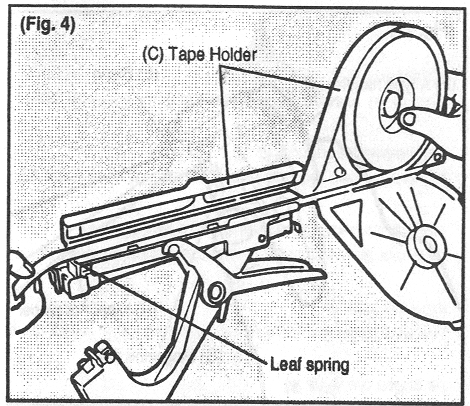 3. It might happen that the tape catch will not catch the tape end when you press the handle. (This is not trouble with the tapener.) If this happens, press the handle harder several more times, and the tape catch will return to its normal position. NOTE:This should be done only when the tape catch does not catch the tape end.
